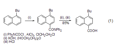 羧基的引入 在alcl3催化下,dpc-cl 可在芳環上引入一個羧基。烷基或烷氧基取代的芳環容易發生反應。產物二基酰胺用堿水解,再酸化可得到羧酸 (式1)[1]。