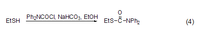 與巰基的反應 在堿性條件下 (如nahco3),在乙醇溶液中dpc-cl可與硫醇反應 (式4)[8]。