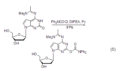 用作寡聚核苷酸合成時的保護基 在合成寡聚核苷酸時,鳥嘌呤核苷的堿基容易發生副反應,需要加以保護,dpc-cl可以將鳥嘌呤堿基的烯醇異構體酰基化而對其進行保護,這種方法在合成具有鳥嘌呤堿基和與鳥嘌呤堿基類似的核苷化合物時[9~12],發揮著重要作用 (式5)。